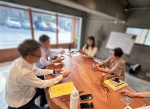 参加者は、昨年同様、会社のコアとなる経営メンバーの面々です。最近、社内で新たに設けられたコワーキングスペースを利用して行われ、前回、テーマとして掲げた新事業のパワーアップにむけ、自分たちが行うアクションを作りこんでいきます。