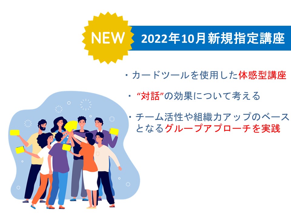 カードソートを使ったグループアプローチを学ぶ講座。組織開発のベースとなる“対話“の効果に着目し、対話とグループアプローチの技法を実践を交え、組織活性化の手法を学ぶことを目的としています。